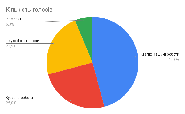 41. Назвіть основні види студентських робіт, які, на Вашу думку, в обов’язковому порядку повинні проходити перевірку на плагіат. (можливо декілька відповідей)